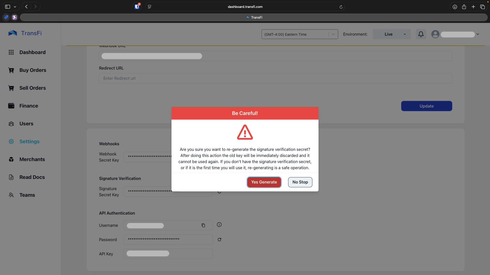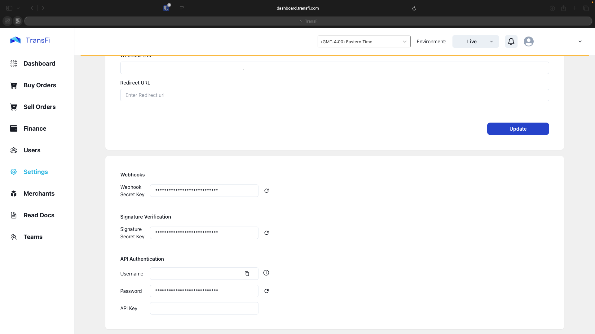 To configure your webhook listener, you can specify your Webhook URL and access the Webhook secret key in the settings section and Integration tab of the TransFi customer platform.